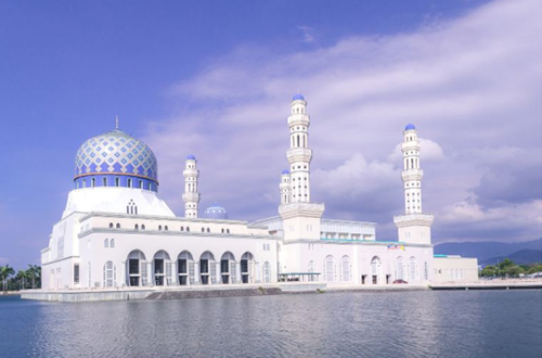 The Kota Kinabalu City Mosque is the second main mosque for the city of Kota Kinabalu in Likas, Kota Kinabalu, Sabah, Malaysia, after the State Mosque in Sembulan. Construction of the mosque cost 34 million Malaysian ringgits. The architectural design is based on the Nabawi Mosque, the second holiest site in Islam, in Medina, Saudi Arabia. The dome is blue and gold, inspired by similar Arabic architecture. It is partially surrounded by a human-made lagoon; this has given rise to the nickname "The Floating Mosque". It has a maximum capacity of 12,000 worshipers.