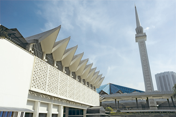 The National Mosque is a mosque in Kuala Lumpur, Malaysia. It has a capacity for 15,000 people and is situated among 13 acres (53,000 m2) of gardens. Its key features are a 73-metre-high (240 ft) minaret and a 16-pointed star concrete main roof. The umbrella, synonymous with the tropics, is featured conspicuously-the main roof is reminiscent of an open umbrella, the minaret's cap a folded one. The folded plates of the concrete main roof are a creative solution to achieving the larger spans required in the main gathering hall. Reflecting pools and fountains are spread throughout the compound. Completed in 1965, the mosque is a bold and modern approach in reinforced concrete, symbolic of the aspirations of a then newly independent nation.